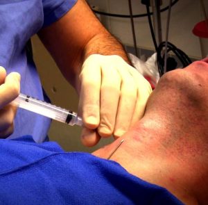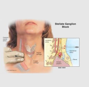 A stellate ganglion block is an injection to block the sympathetic nerves located on either side of the voice box in the neck. An injection at these nerves may reduce symptoms such as pain, swelling, color, sweating changes in the upper extremity and may also improve mobility.