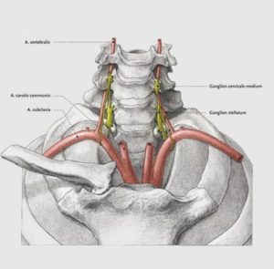 Stellate ganglion blocks may be therapeutic (to relieve pain) and/or diagnostic (to determine the source of your pain). These nerves are a part of the sympathetic nervous system. Image-guided stellate ganglion blocks have the advantages of increased safety and accuracy compared with blind injections. The needle can be accurately placed near the stellate ganglion, and, as a result, a safer and smaller amount of drug can be used, reducing the risk of adverse effects.